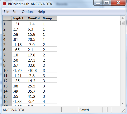 A data editor is included with BIOMstat. It makes it easy to create files in the proper format. A typical view is shown below.